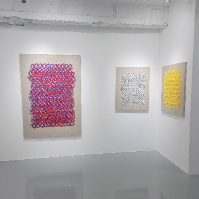 김민주에게 시간은 모순적인 존재입니다. 덧없지만 무한하고, 연약하지만 굳건합니다. 그녀의 작품은 정교하게 엮인 "물감실"로 구성되어 시간의 쉼 없는 흐름과 그것을 멈추고자 하는 예술가의 열망을 담고 있습니다. 작가는 고향에서 보았던 반짝이는 물결과 전통 매듭의 아름다움에서 영감을 받아자신의 작품 안에 유한한 것과 무한한 것을 하나로 엮었습니다. 각각의 실은 사랑의 지속적인 힘에 대한 찬사이며, 어머니의 포옹, 물 위에 비치는 순간의 반영, 또는 소박한 매듭 속에 담긴 조상의 유산을 담고 있습니다.